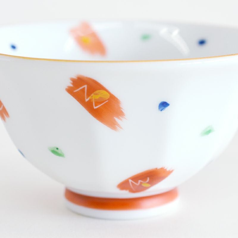 手描きの刷毛目とカラフルなドットを配したモダンな印象の織部オリジナル茶碗です。