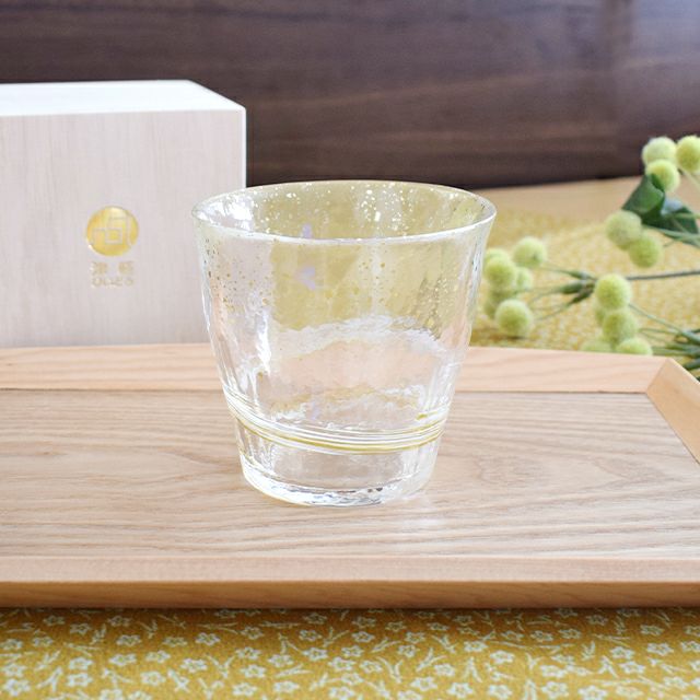津軽びいどろの金彩ロックグラスは、桜・雫・春・宵・麦・碧・霧・夕の8種類。