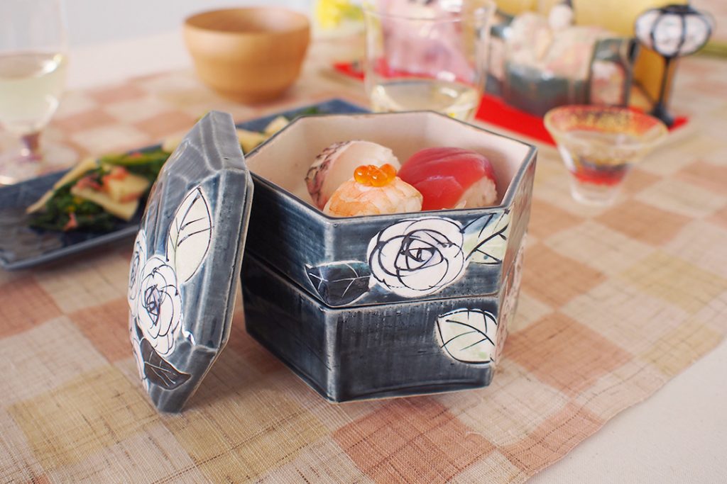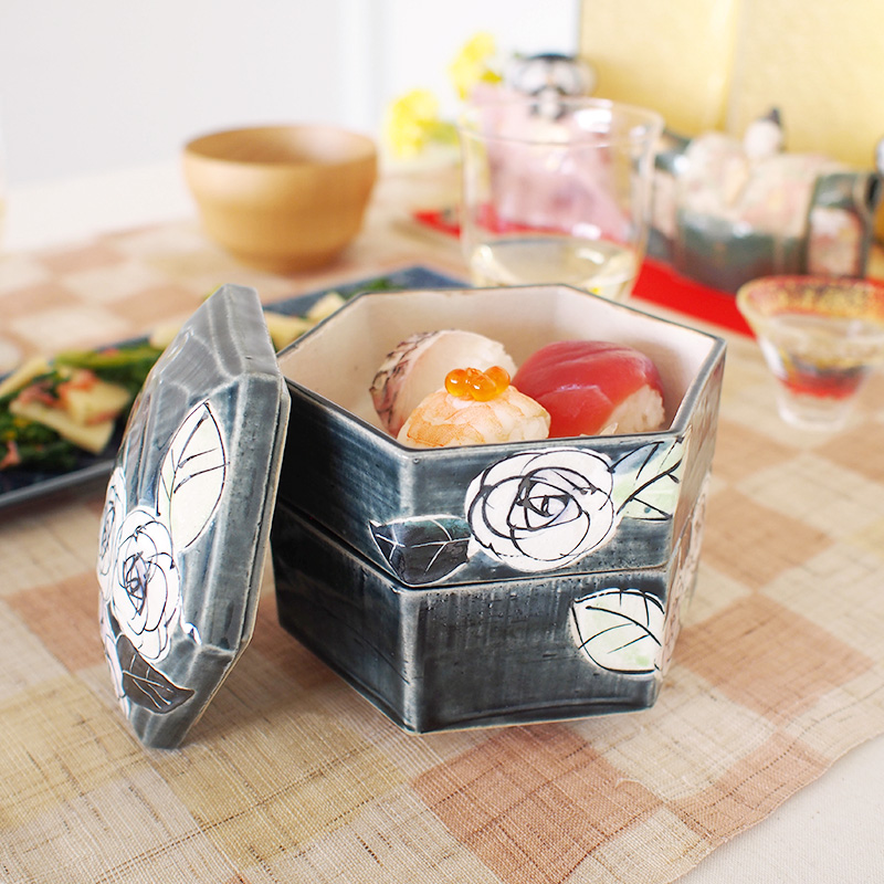重厚な佇まいの器に手描きによる薔薇が大胆な構図で描かれた六角の二段重です。