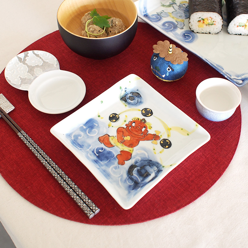 波佐見焼の窯元「陶工房 楽」がつくる風神の鬼絵正角皿です。「鬼絵」にこだわり描かれる作風はぬくもりがあり、やさしい表情の鬼になります。/RAKU鬼絵 正角皿(中) 風神  3,080円(税込)